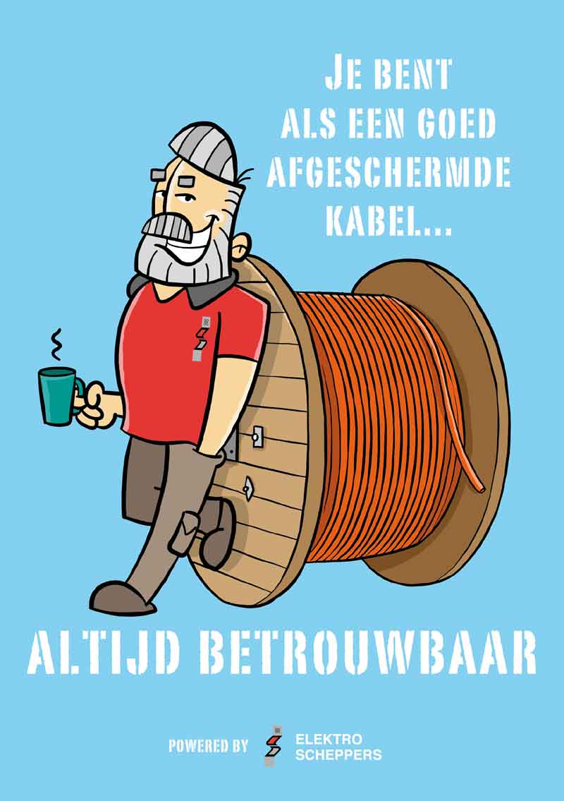Wellicht herinner je ze nog: de zogenoemde Boomerang Cards die je gratis in de kroeg of jeugdsoos kon krijgen. Opvallende kaarten met ludieke en soms scherpe teksten. Dat wilde men bij Elektro Scheppers ook. Alleen dan kaarten specifiek voor de installatiebranche. Na veel gepuzzel én hulp van Lisa Rouwenhorst hebben we een mooie reeks op de mat kunnen leggen.