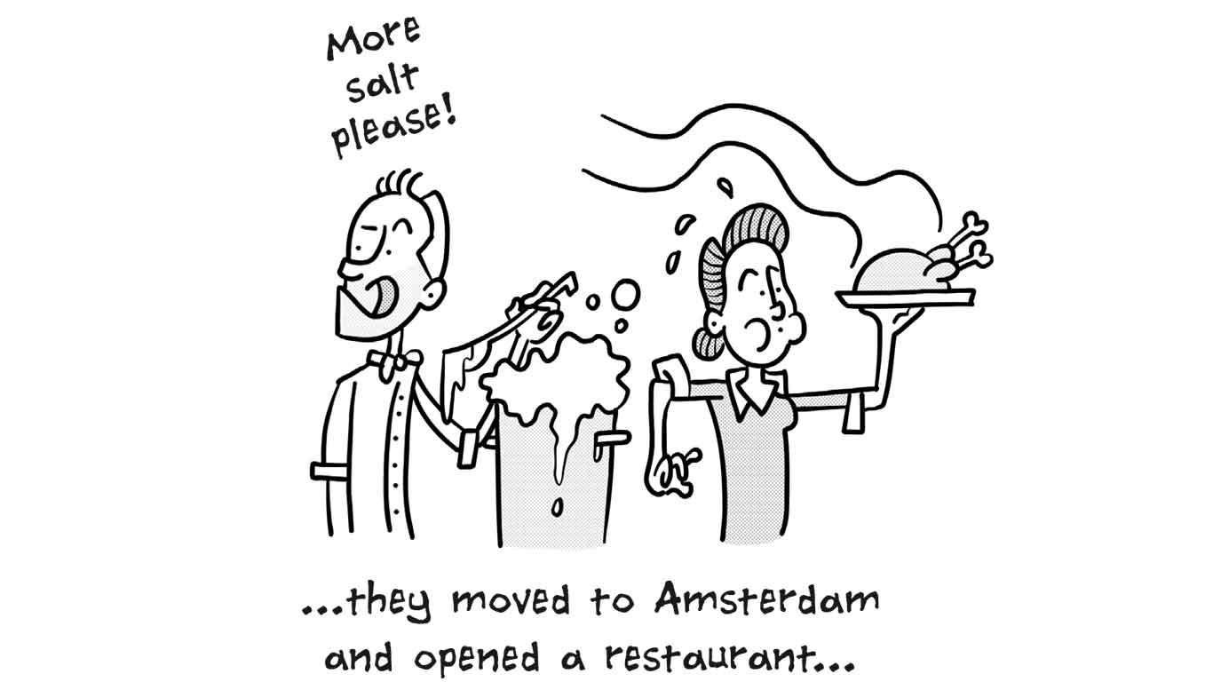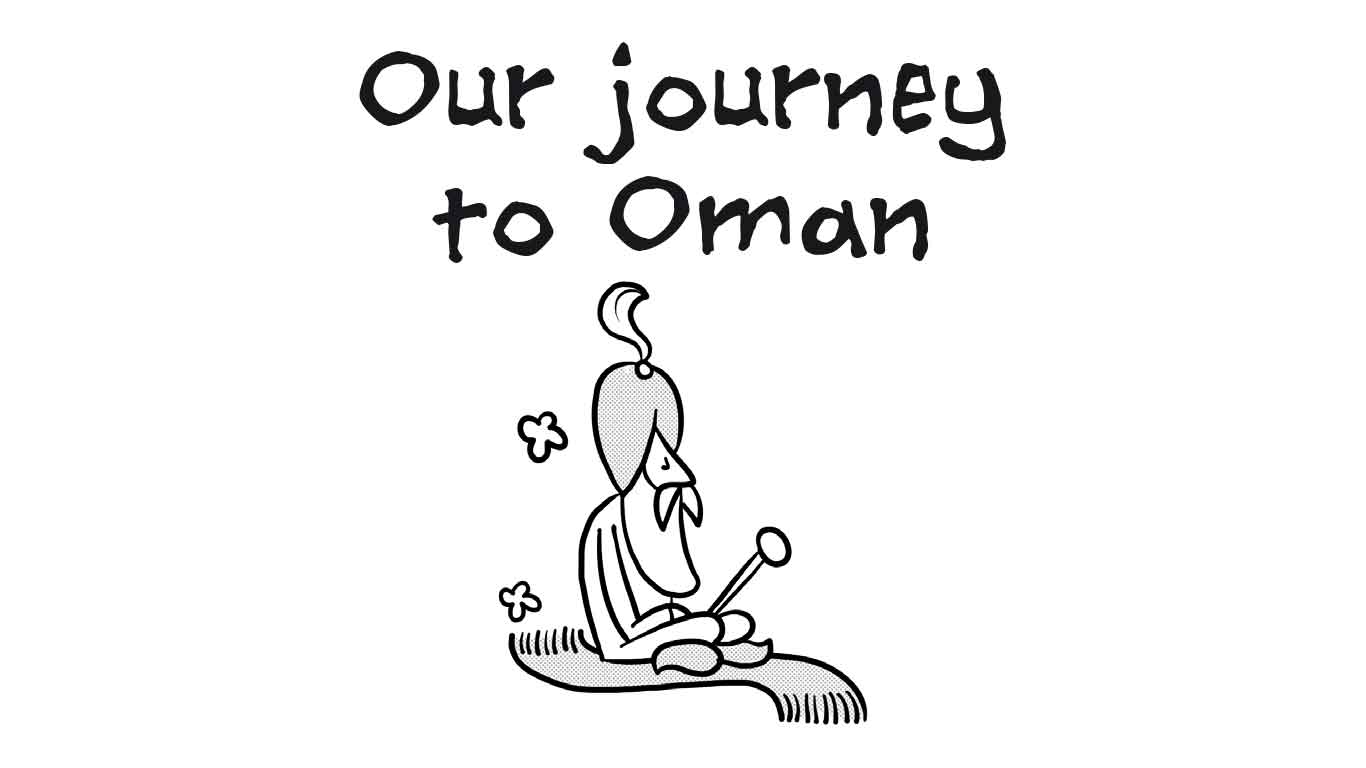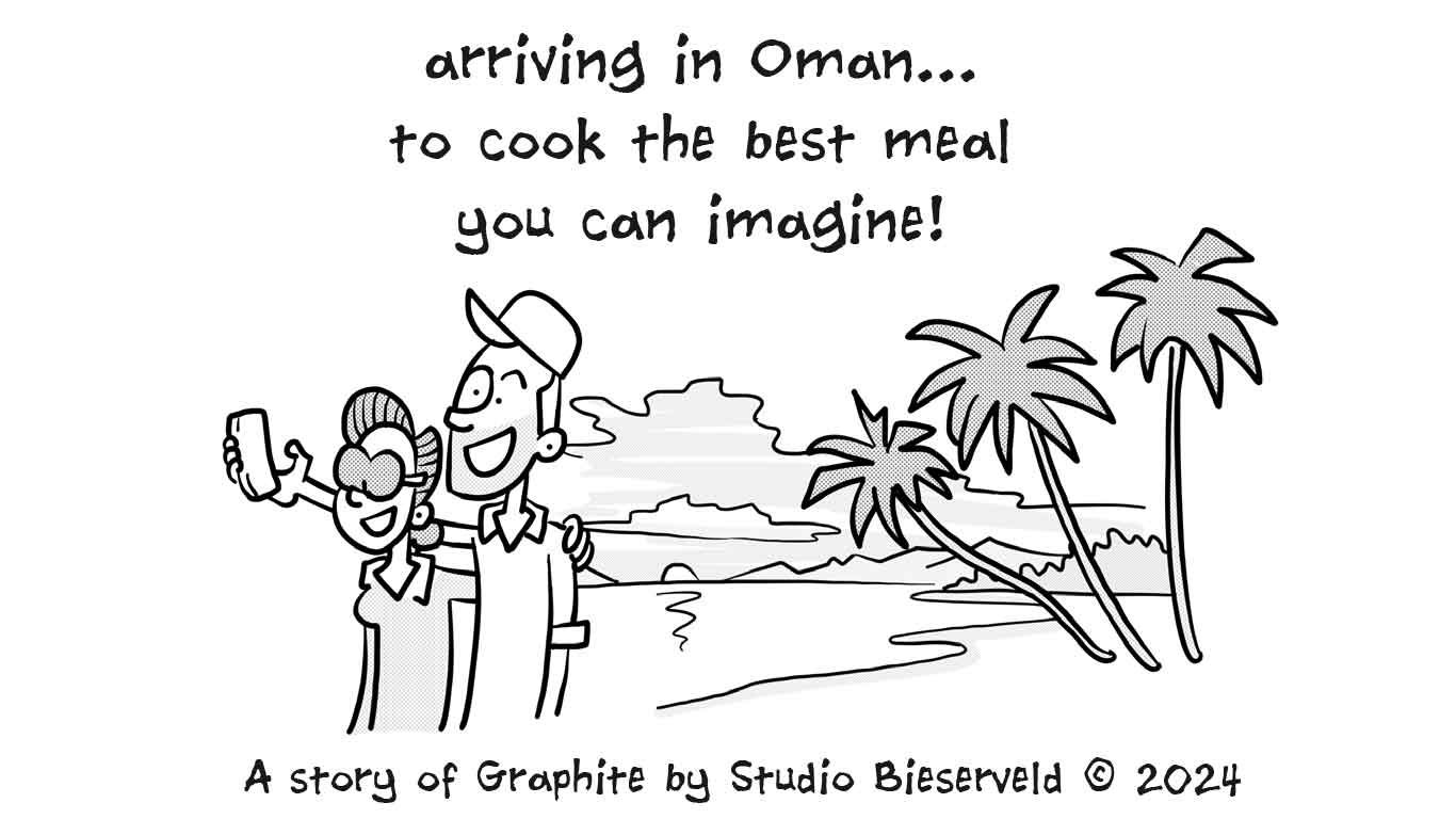 Peter Gast, jarenlang eigenaar van restaurant ’t Schulten Hues (mét 1 Michelinster) in Zutphen en inmiddels actief in onze hoofdstad met restaurant Graphite, mailde met de vraag of er een korte strip gemaakt kon worden over hun aanstaande avontuur in Oman. De strip vertelt het verhaal van het echtpaar Gast dat als twee Achterhoekse boertjes afreist naar Oman om daar hun kookkunsten te vertonen. De cartoon is geprint op A4 formaat en diende als onderlegger onder 1 van de exquise gerechten.
